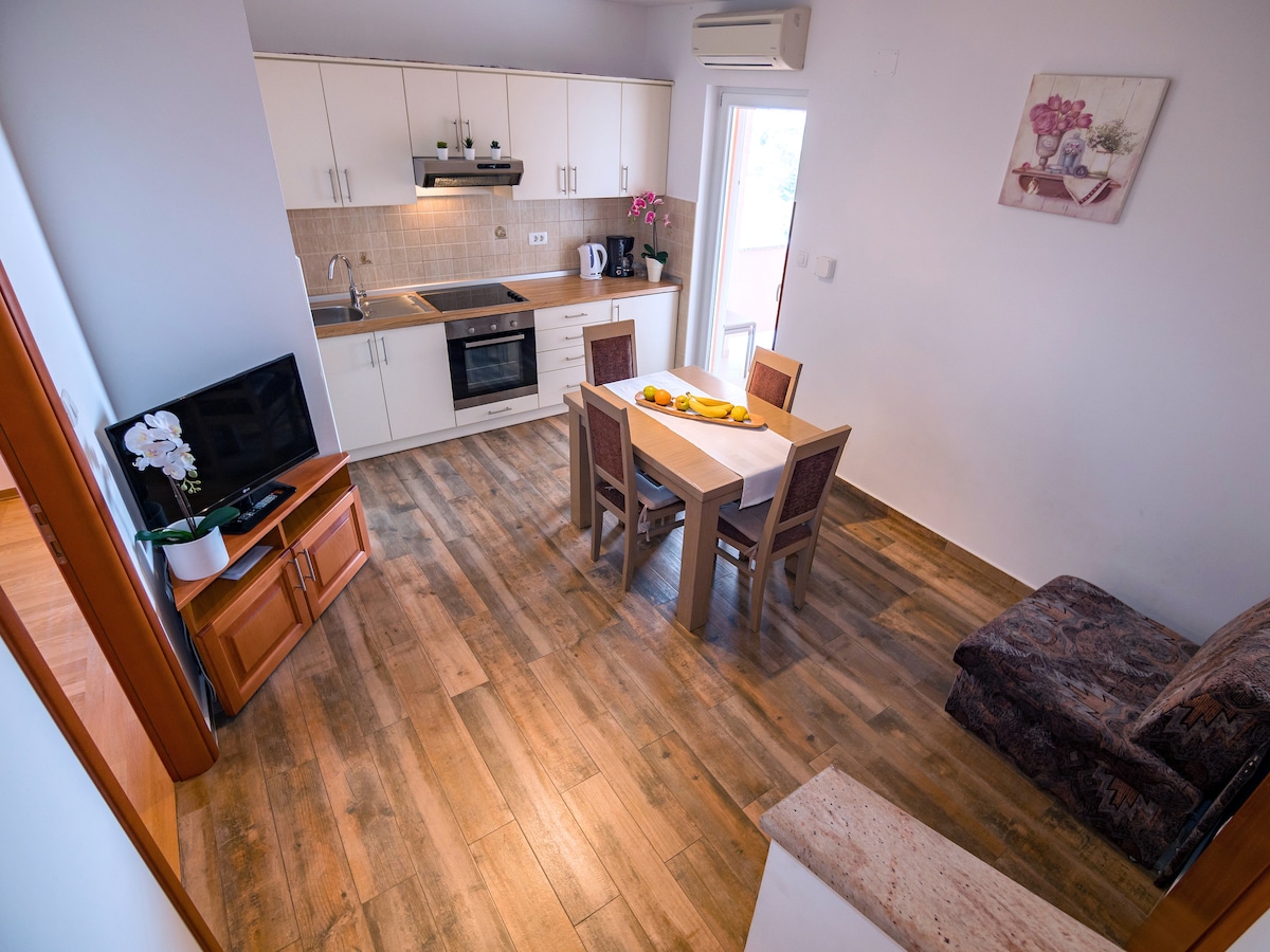Ada satu apartemen yang lebih besar,satu studio yang lebih kecil, apartemen baru didekorasi, dengan tempat parkir yang aman, di tengah - tengah . Dekat ACI marina, lapangan sepak bola, sekolah, pantai berjarak 200 meter. Kemampuan untuk menggunakan barbeku di patio luar ruangan. Apartemen ini menghadap ke laut dan dari kamar tidur dan dari penginapan. Masing - masing kamar memiliki balkon dan kamar mandi pribadi. Menginap termasuk meja makan dapur dan teras yang menghadap ke laut. Boleh membawa hewan peliharaan dengan biaya tambahan.