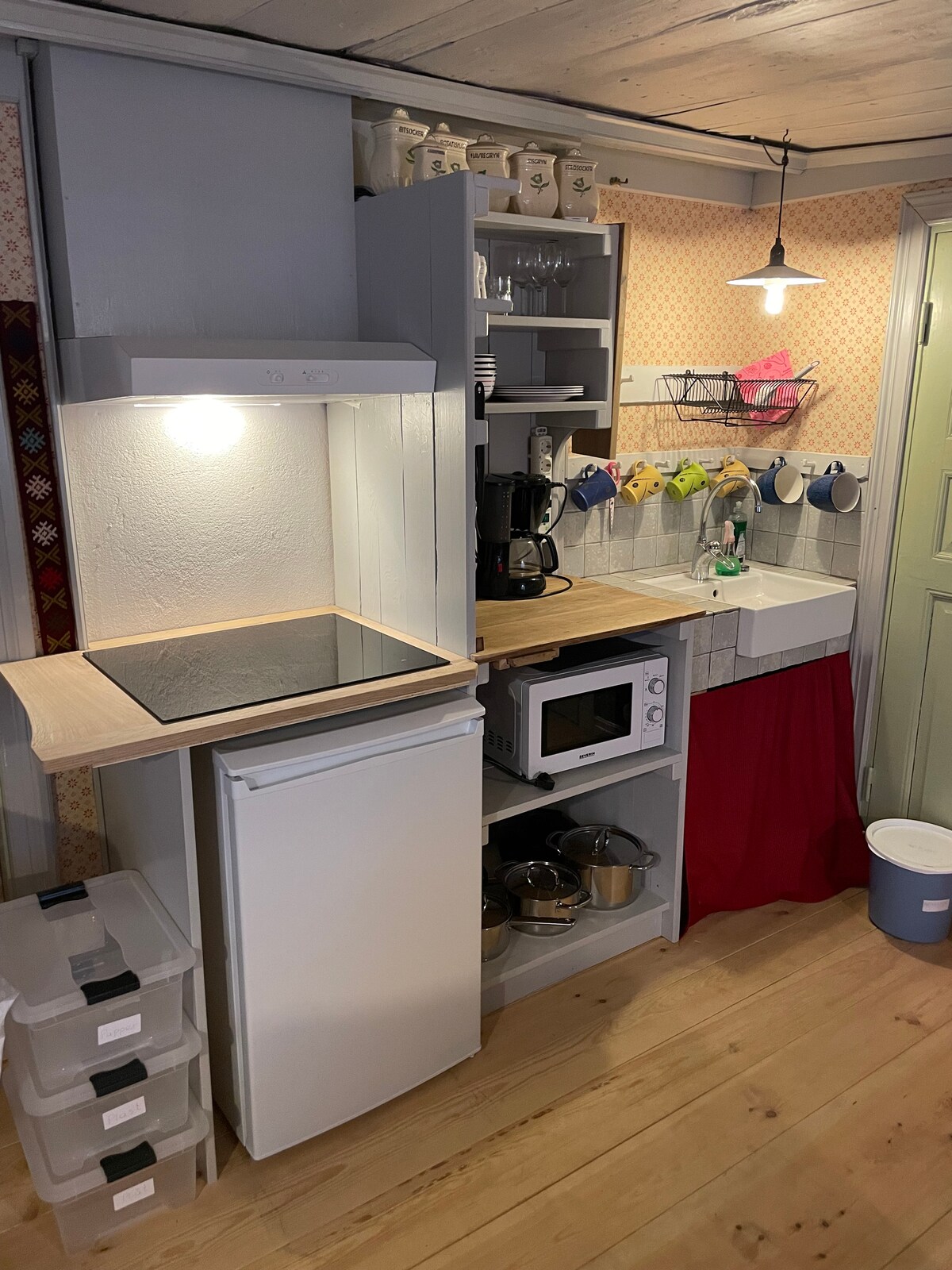 Kotak pengisian daya untuk mobil listrik. 15 menit naik mobil ke kota abad pertengahan Arboga. Pintu masuk pribadi dari halaman. Akomodasi ini terdiri dari ruang tamu yang menghadap padang rumput dan padang rumput kuda. Kompor kayu. Kasur lantai lebar 1,2 m. Meja. Kursi berlengan. Pintu keluar ke teras. Satu kamar tidur dengan tempat tidur susun. 2 lemari. Satu jendela. Ruang TV dengan dapur kecil, hot plate, microwave, kulkas, dan wastafel. Pemandangan halaman ke arah barat. WC dan shower dengan pemandangan gereja. Dekat dengan hutan dengan buah beri, jamur dan kehidupan liar, jalur jalan kaki yang indah di lingkungan setempat.