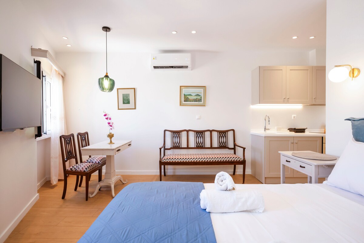 Terletak di jantung Garitsa Bay, penthouse yang baru direnovasi di lantai enam ini akan memenuhi permintaan tamu yang paling diminta. Teras eksklusif penthouse, menghadap teluk, hanya berjarak 30 meter dari garis pantai. Pemandangan indah di atas kastil tua Corfu, laut, dan kincir anginnya menakjubkan. Apartemen ini terdiri dari satu kamar tidur dengan tempat tidur ganda, ruang tamu dengan tempat tidur yang berubah menjadi tempat tidur ganda, dapur, dan Wc, semuanya baru.