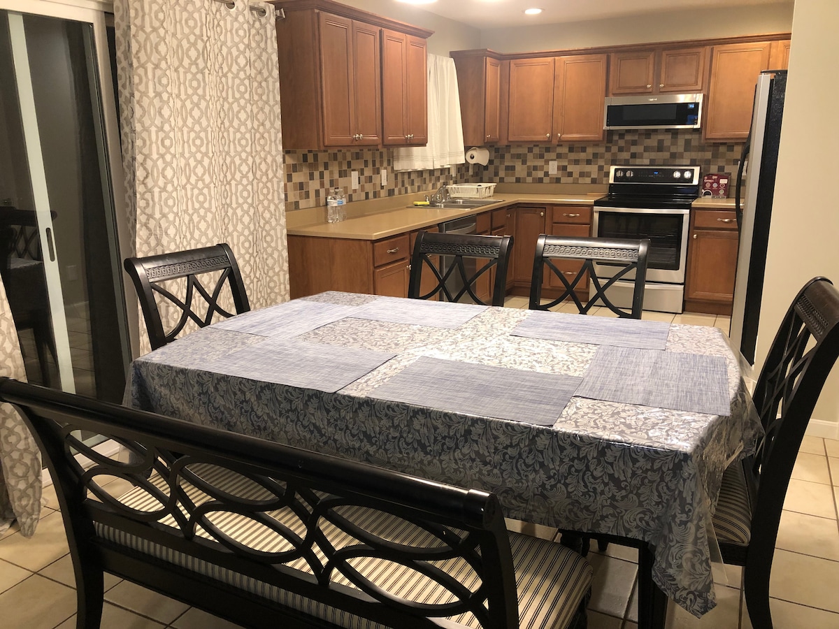 This is an Apartment /Mother in law suite that is connected to my home. You have a separate Front and Back door. One bedroom, Full kitchen, queen bed, and queen sofa bed in the livingroom. Driveway Parking. Backyard and Sun porch are shared spaces that includes a huge in-ground pool, beautiful screened in sun porch, outdoor dining, fire pit, hot tub, and the backyard is fully fenced in. The pool is closed, will reopen Early April. Laundry and Ev Charger can be used upon request for a fee.