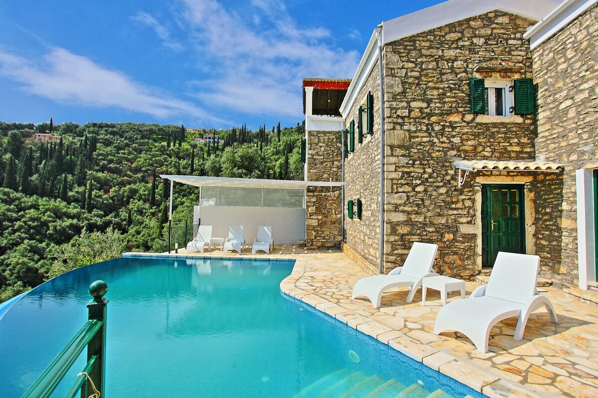 Ideally located on the top of a mountain at the central traditional Greek village Evropouloi, only a 10 minutes by car from both Corfu Town and Corfu Airport and 20min from the most famous beaches , this stunning newly renovated stone house is the perfect place for your Greek holidays.Offering breathtaking views across the Ionian channel to the Greek mainland beyond.