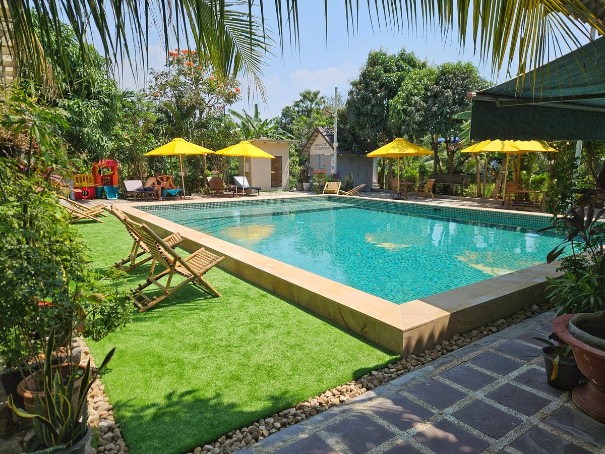 Bersantailah dan bersantailah di tempat yang tenang dan bergaya ini. Menginap di vila 5 tempat tidur, 4 kamar mandi kami di Kep yang dirancang dengan ketenangan, dan tempat peristirahatan yang tak terlupakan bagi keluarga, teman, atau rombongan besar. Cocok untuk 12 -20 tamu. Terletak di jalan utama Kep, namun dirancang untuk privasi, kedamaian, dan keamanan, nikmati kolam renang besar dengan pergola untuk makan malam yang diterangi bintang, BBQ & dapur lengkap, dan tanaman hijau yang rimbun. Dikelilingi pepohonan, tempat ini sangat cocok untuk keluarga dan rombongan. Pesan sekarang untuk masa inap yang menenangkan dan tak terlupakan!