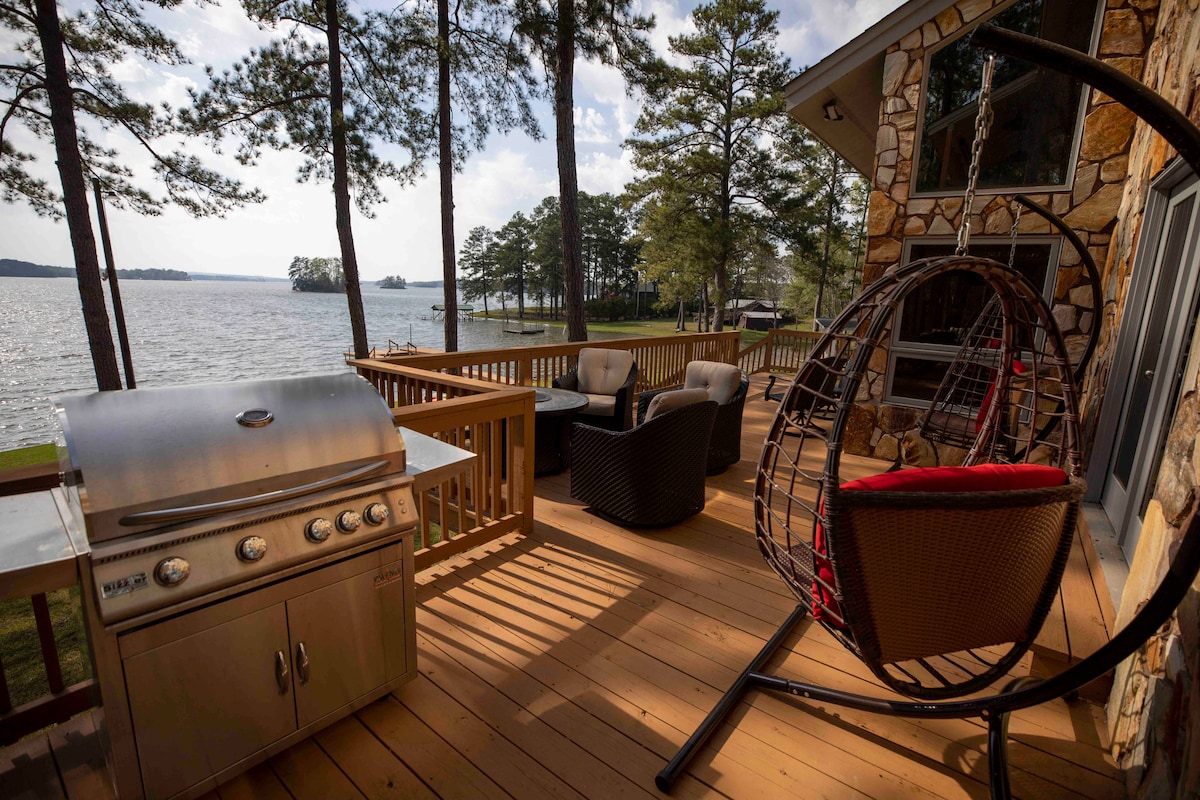 See fireworks show right from your private dock & boat ramp! Great Escape on Wateree is a professionally designed lakefront home w/ luxurious hotel bedding, fully stocked kitchen, 3 full bathrooms, Fast Wi-Fi, 4 Smart TVs, fully fenced property, fire-pit, gas grill, game room, 'Cozy Clubhouse' & upstairs loft LOVED by kids. We provide kayaks, paddle boards, lily pad, life vests, & yard games. Enjoy striking sunsets, 3 King & Queen en suites. Self check-in. Trailer in your boat or rent nearby.