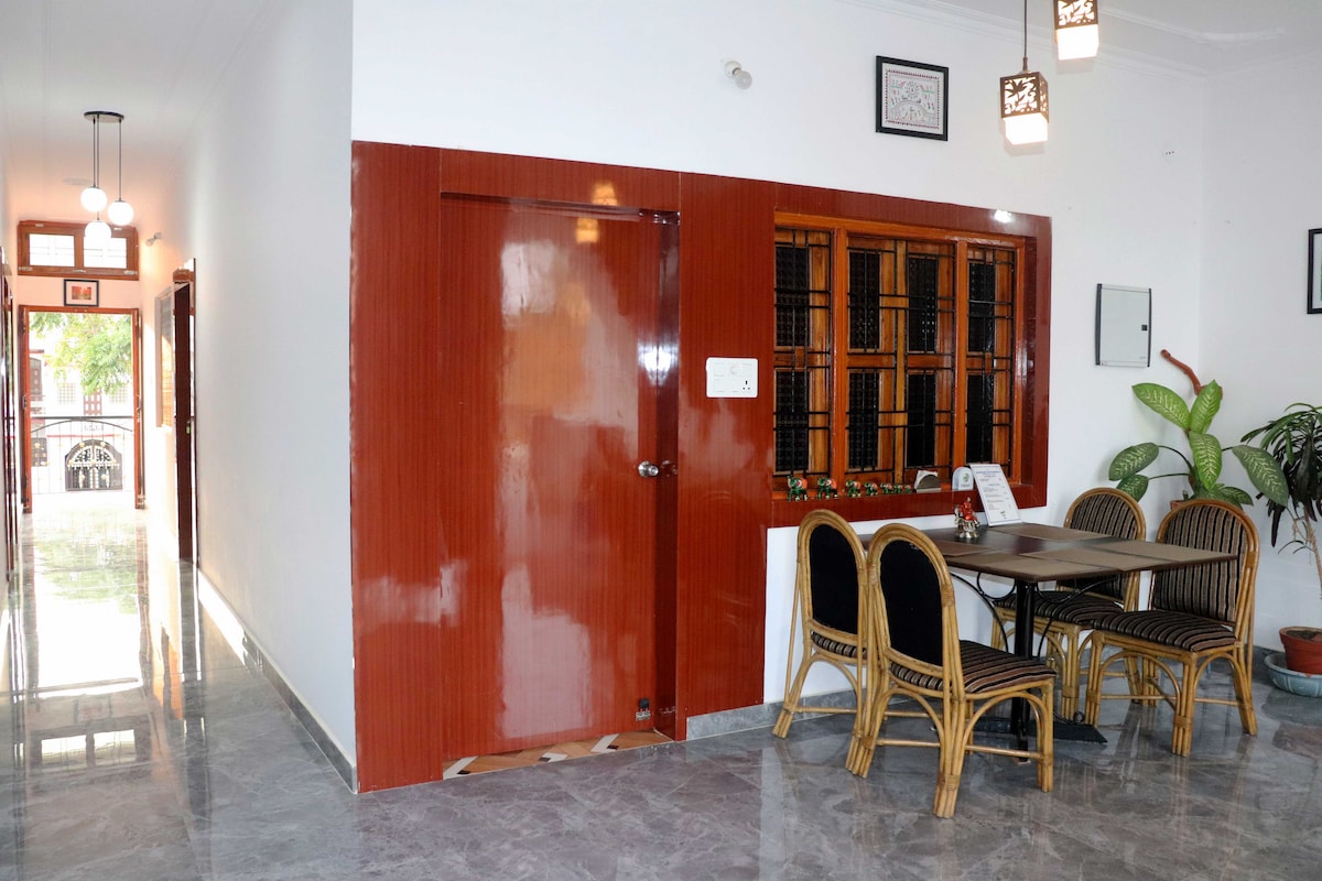Homestay keluarga untuk Anda sekeluarga. Kami memiliki total enam kamar, dua dengan AC dan empat dengan kipas angin. Setiap kamar memiliki kamar mandi pribadinya sendiri dengan pancuran air panas dan sampo/sabun batangan. Rumah ini berada di dekat rombongan kuil Barat, 10 menit berjalan kaki dari pusat desa dan 20 menit dari stasiun kereta api (dengan mobil). Di rumah saya Anda akan memiliki sarapan pelengkap dan Anda juga bisa mencoba makanan India untuk makan siang atau makan malam.