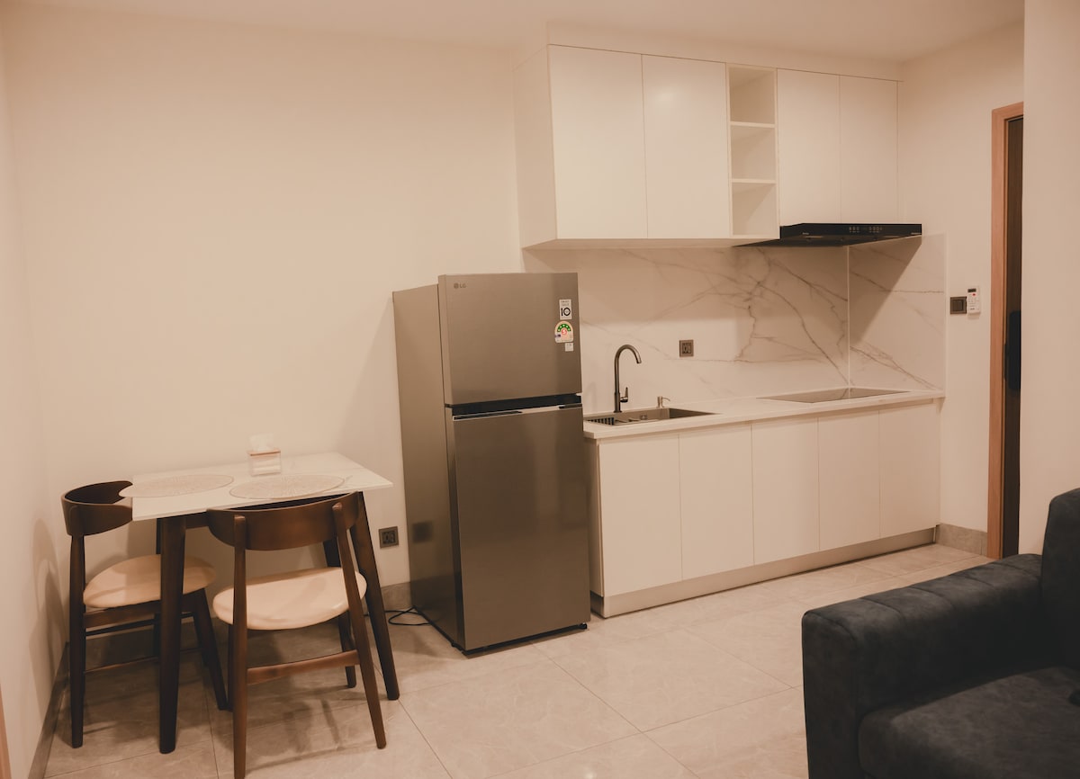 Nikmati masa inap bebas repot di The Garden Residency 2 di Sen Sok. Kondominium yang bersih, modern, dan berperabot lengkap yang cocok untuk pasangan, petualang solo, atau pelawat bisnis. Apartemen: 40 meter persegi, 1 kamar tidur (Pribadi), AC, dapur, kulkas, mesin cuci, & ruang tamu dengan area makan. Fasilitas resor: Akses ke kolam renang besar dan pusat kebugaran. Veranda Pribadi: Tempat yang bagus untuk udara segar dan bersantai. Lokasi Utama: 5 menit berjalan kaki ke Makro Market / 8 menit berjalan kaki ke AEON Mall 2.