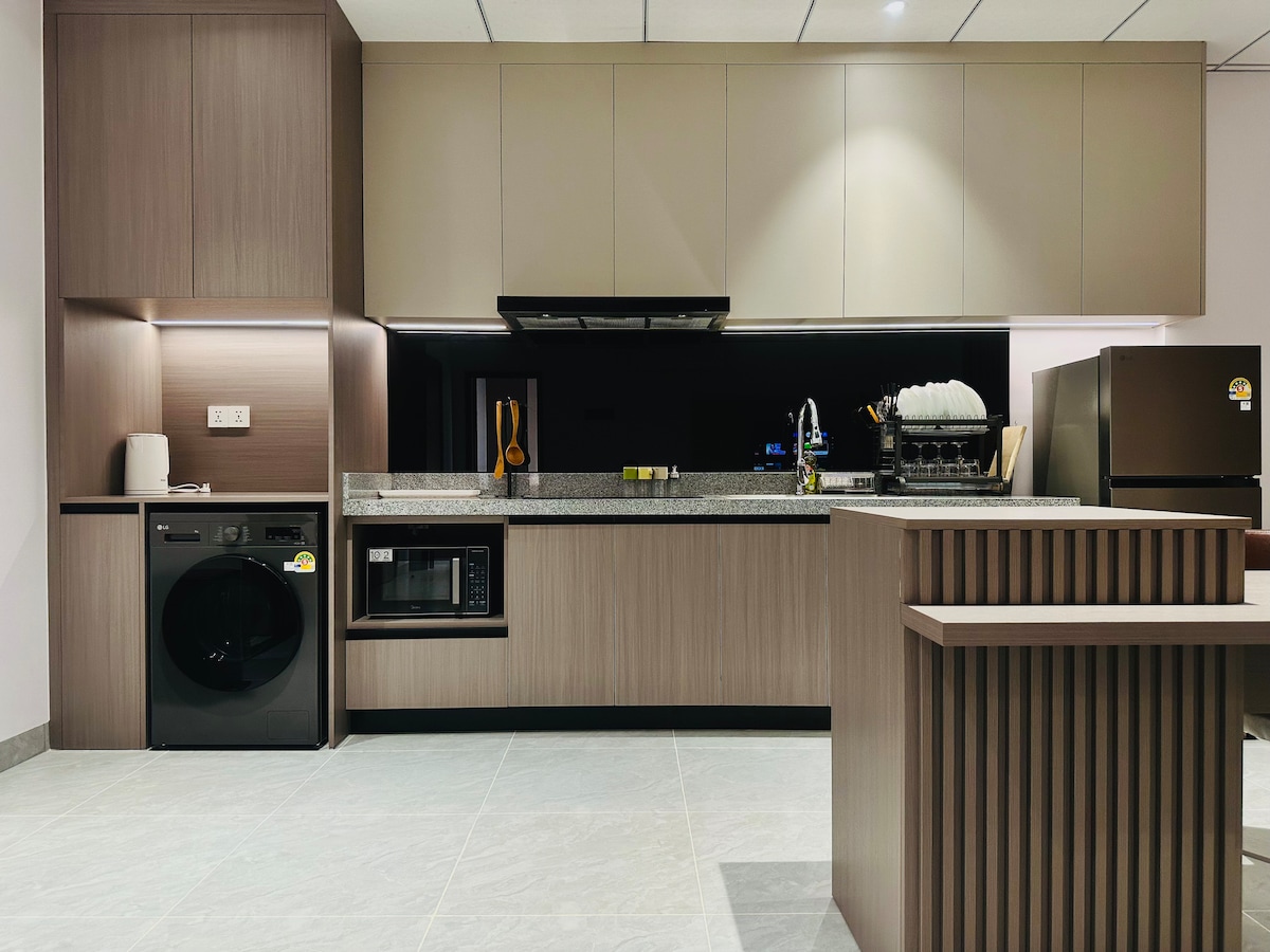 Nikmati masa inap bebas repot di The Garden Residency 2 di Sen Sok. Kondominium yang bersih, modern, dan berperabot lengkap yang cocok untuk pasangan, petualang solo, atau pelawat bisnis. Apartemen: 40 meter persegi, 1 kamar tidur (Pribadi), AC, dapur, kulkas, mesin cuci, & ruang tamu dengan area makan. Fasilitas resor: Akses ke kolam renang besar dan pusat kebugaran. Veranda Pribadi: Tempat yang bagus untuk udara segar dan bersantai. Lokasi Utama: 5 menit berjalan kaki ke Makro Market / 8 menit berjalan kaki ke AEON Mall 2.