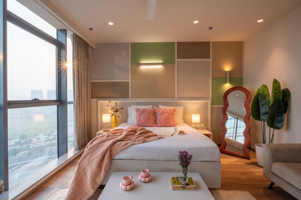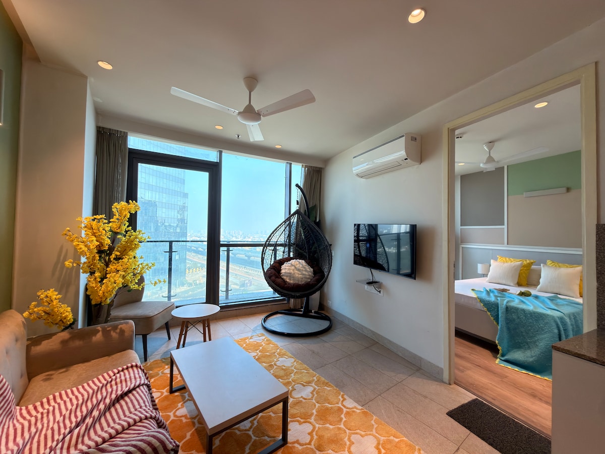 Above the city on the 10th floor, it's your 1 BHK studio that believes in two things: good vibes and great views. Wrapped in greens, soaked in height, and styled to relax, this is your private escape between Dwarka & Gurgaon super close to the Delhi International airport. Perfect for couples, tourists, corporate knights, staycations or meetups.
