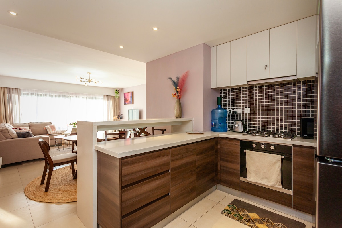 Immerse yourself in colour and calm at The SpatialPlace... This unique 2BR serviced apartment is tastefully designed with bold magenta and teal accents that create an unforgettable atmosphere. Surrounded by beautiful treetop views, it’s a hidden gem designed for comfort and style. Centrally located in Lavington, it’s a short drive from high-end malls, pharmacy, 24 hr supermarket, restaurants & entertainment venues. Enjoy a cozy retreat, a classy get-together or quality time with family.