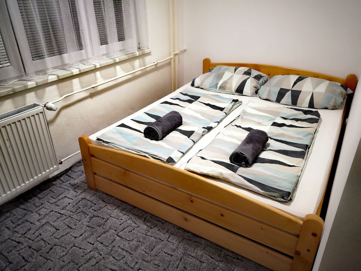 The apartment is located on the ground floor of the apartment building. The apartment was fully renovated in 2017. The kitchen is connected to a spacious living room. There are 2 bedrooms. In the first bedroom there is one double bed and one single bed. In the second bedroom there is one double bed. A baby bed is available on request. From the stylish hallway you enter the smaller bathroom with a spacious shower enclosure. Everything is new, clean and modern. Free parking.
