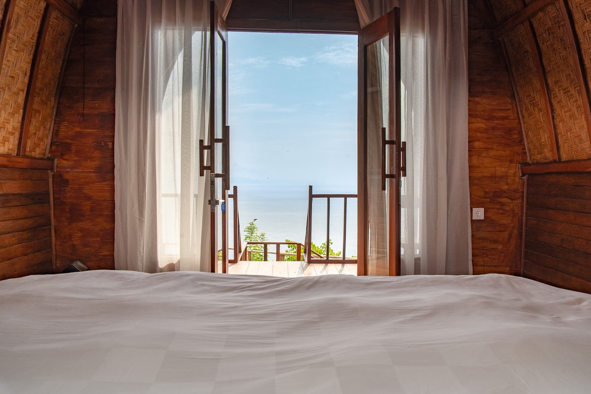 Balkon Pribadi Bungalow Bambu Pemandangan Laut Deluxe