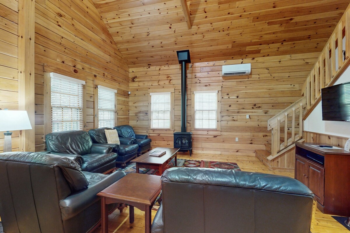 Kabin 2BR yang nyaman dengan dapur, perapian & jalan setapak