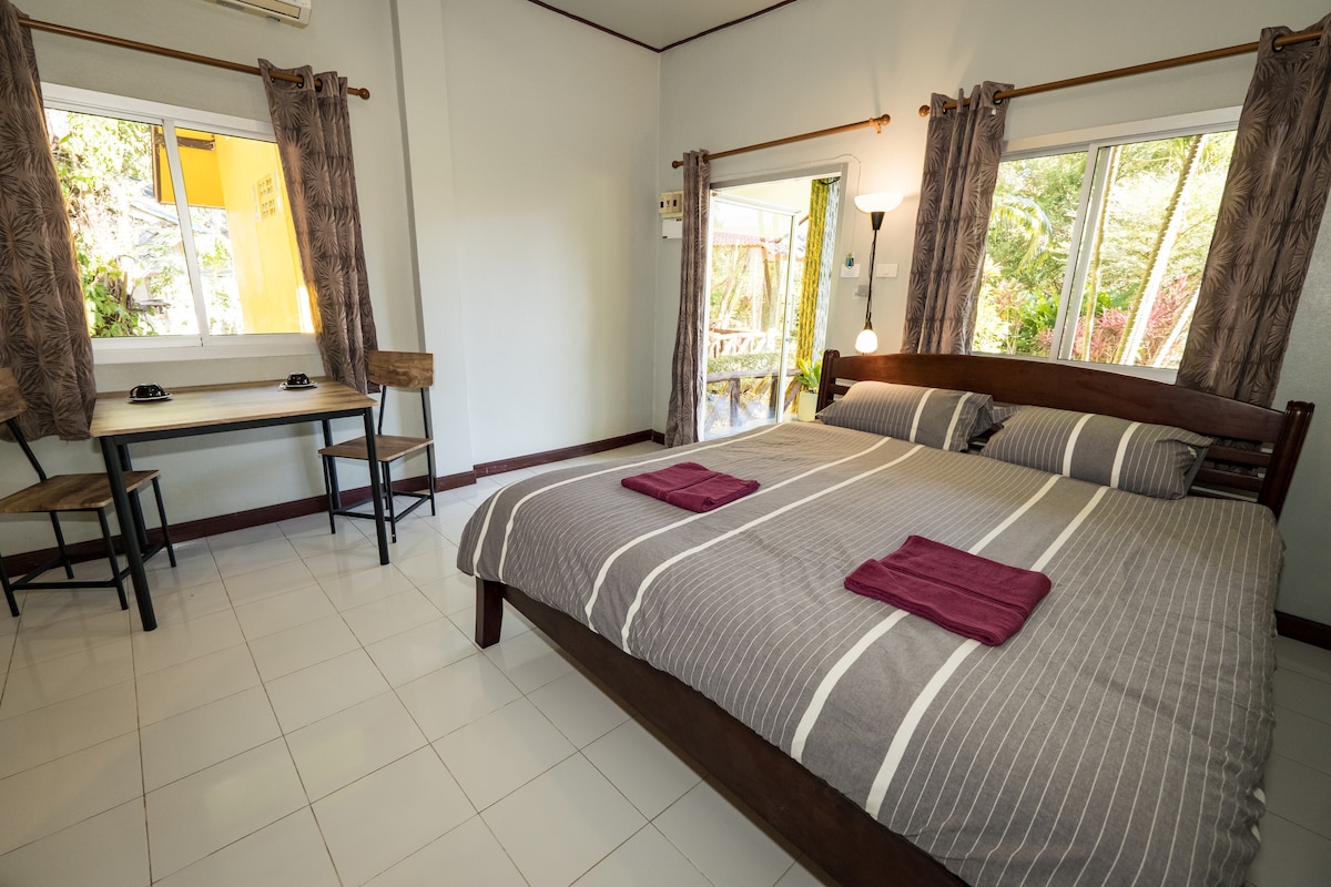 Bungalo nyaman berlokasi di resor yang tenang, di taman di Klong Prao, 200 m dari pantai dan 200 m dari jalan utama. AC, kulkas, kamar mandi pribadi dengan pancuran air panas, WiFi yang bagus, TV dengan Netflix. Tamu kami memiliki akses ke dapur bersama di luar resepsionis kami. Membersihkan sesuai permintaan secara gratis.