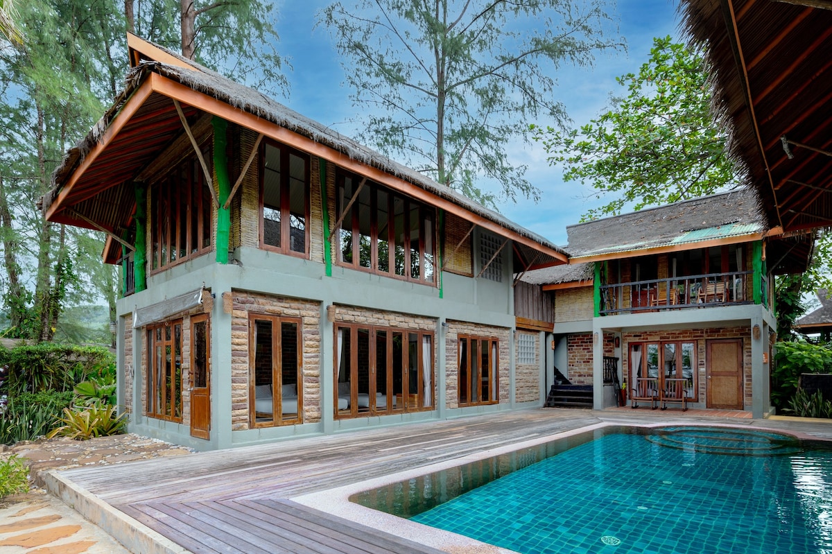 Villa tepi pantai yang luas di Koh Mak yang seperti mimpi, di Teluk Thailand, menawarkan pemandangan matahari terbenam yang menakjubkan dan nuansa pulau yang santai. Nikmati teras atap yang luas, balkon, dapur kecil luar ruangan dasar, AC, Wi-Fi cepat, dan meja kerja khusus—ideal untuk masa inap yang lama. Tamu memiliki akses ke kolam renang bersama dan fasilitas olahraga terbaik, termasuk sekolah Muay Thai profesional, yoga (atas permintaan), pusat kebugaran terbuka, tenis, bola basket, dan tenis meja—sempurna untuk bekerja, berlatih, dan memulihkan diri di tepi laut.
