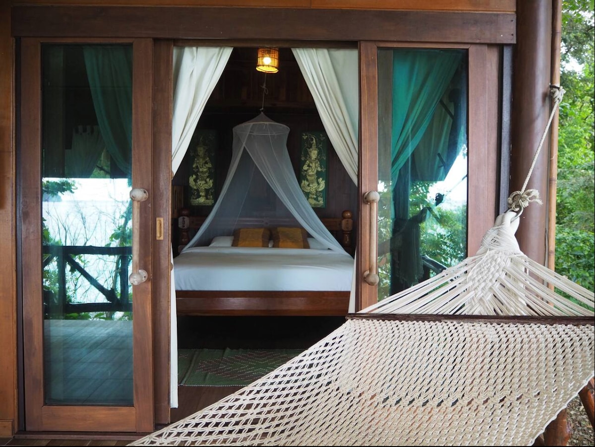 We operate beautiful unique villas which locates in a quiet sid of Phi Phi islands. We are conveniently located next to our main beach and restaurant. All of our villas are uniquely decorated in a Thai fasion. This particular villa is right by the cliff out looking to the Andaman sea. There is a big patio with a hammock for guests to unwind and relax listening to the sound of the waves.
