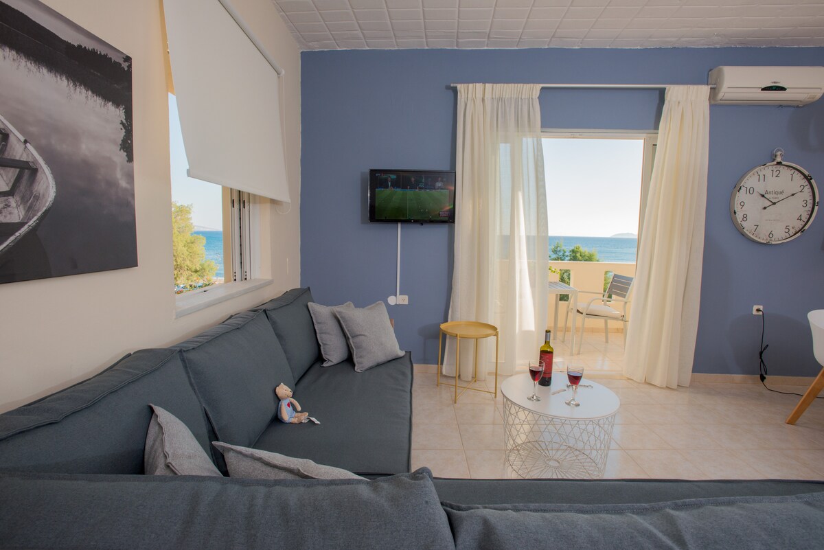 Apartemen ini luas dengan gaya modern dengan pemandangan laut yang menakjubkan. Berada di lantai dua dan hanya berjarak 100 m dari pantai. Tempat ini memiliki balkon sendiri dan mencakup tempat tidur double, dua tempat tidur single, tempat tidur sofa, kamar mandi pribadi (bak mandi / toilet), dapur dengan kompor listrik, mesin kopi, pemanggang roti, ketel, pinggiran, dan AC. Cocok untuk pasangan atau keluarga yang memiliki anak. Akses internet nirkabel gratis. Pantai Kokkinos Pirgos adalah pantai berpasir yang sangat panjang.