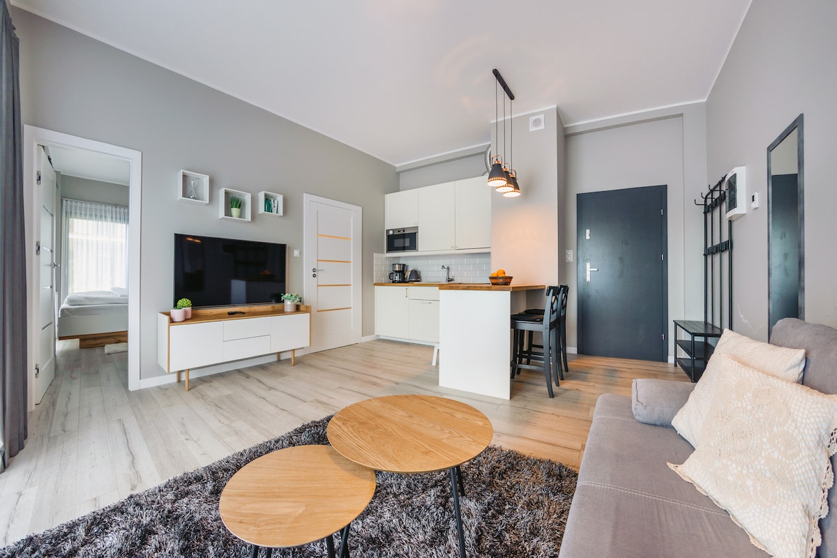 Apartemen yang modern, luas, dan nyaman di kompleks 'Platany' yang terletak di Pulau Solna di pusat Kolobrzeg. Apartemen dengan balkon dan pemandangan Kanal Drzewny yang indah ini terletak di lantai 5 gedung yang dilengkapi dengan lift. Cocok untuk hingga 4 orang, ini adalah pilihan sempurna untuk liburan bersama teman atau keluarga serta bekerja jarak jauh. Untuk orang tua yang bepergian dengan anak - anak kecil, tempat tidur bayi dan kursi makan bayi juga tersedia (atas permintaan).