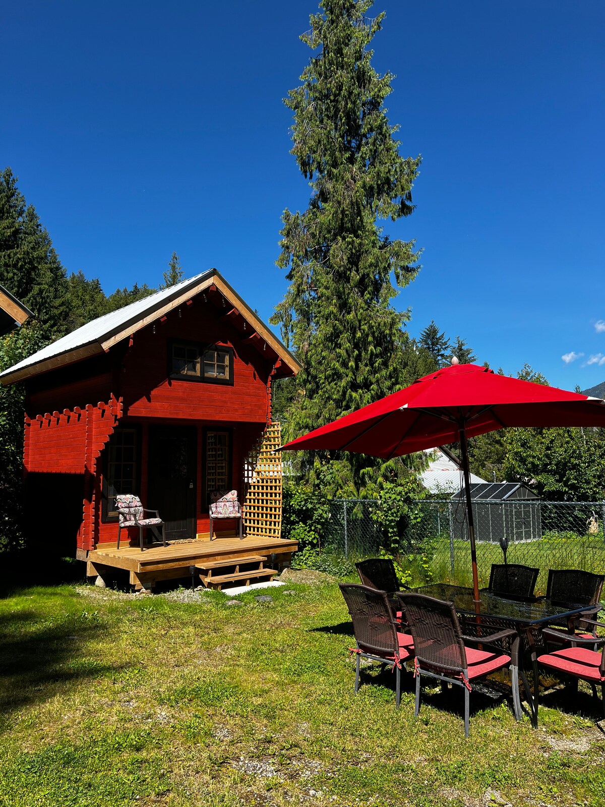Relax at our creekside peaceful mountain getaway. We are located 6 minutes from the Whitewater ski hill turn off and only 2kms from historic downtown Baker St. You will find the most unique Airbnb in Nelson offering three private cozy cabins with a very comfy queen bed upstairs and futon downstairs. Our huge common area has lounging areas, full kitchen, gym, pool table, air hockey, dart board and games. Perfect for hanging out with friends. The new bathrooms are in this EPIC SEPARATE BUILDING