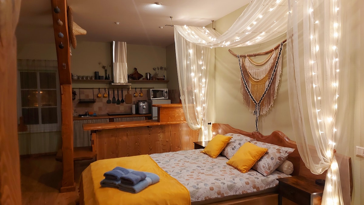 Cozy studio for rent in a lovely village by the sea.A great place for your holiday!Studio has a separate entrance with a hall, inside the studio- double bed and sofa, kitchen, fridge, washing machine and etc. Outside - barbecue place, parking,WIFI. Outside sauna and heated bubble bath (jacuzzi) is available for additional cost.