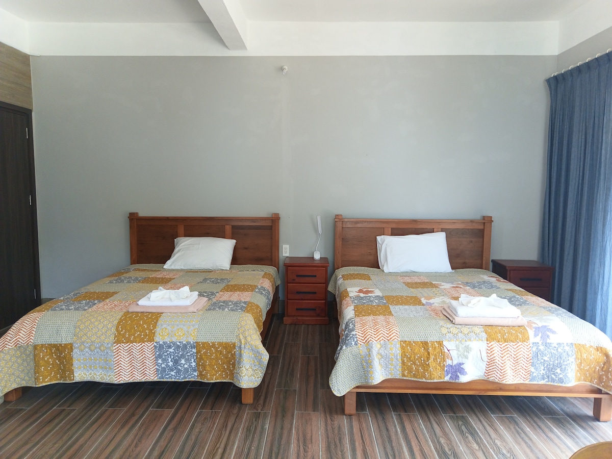 1 tempat tidur double + 2 tempat tidur single dengan pemandangan pegunungan yang indah.