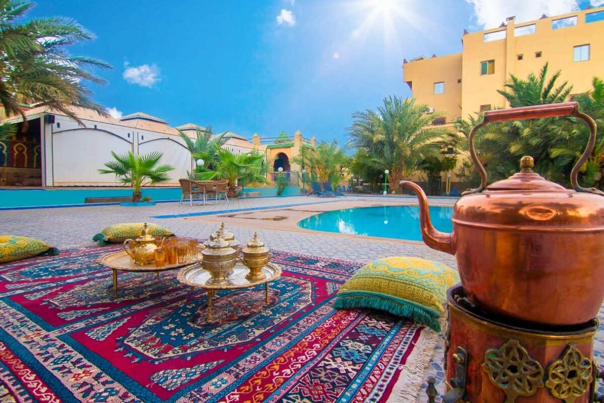 Sangat jarang menemukan tempat yang bersejarah dan unik. Riad ini akan memungkinkan Anda merasakan pengalaman yang benar-benar unik. Cocok untuk keluarga atau sekelompok teman. Kolam renang, ruang terbuka yang luas, ruang santai tradisional yang besar, semuanya disatukan untuk menikmati pesona Sahara dan wilayah kami. PS: Hanya untuk privatisasi.