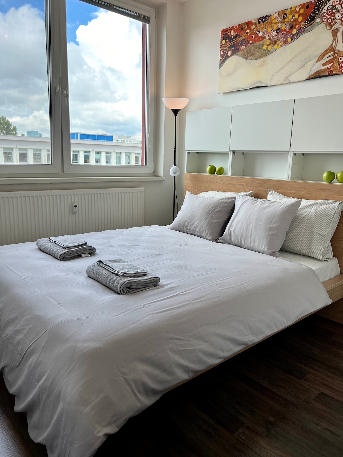 Enjoy a stylish experience at this centrally located place, suited for shorter travelling trips as well as for longer business trips. The apartment features a fully equipped kitchen, a queen size bed, a sofa and a balcony with a nice view to the quiet inner block of this newly built residential building. The apartment doesn’t have a parking spot available, but you can easily move around the city by walk, shared bikes or public transport as there are bus and tram stops closeby the apartment.