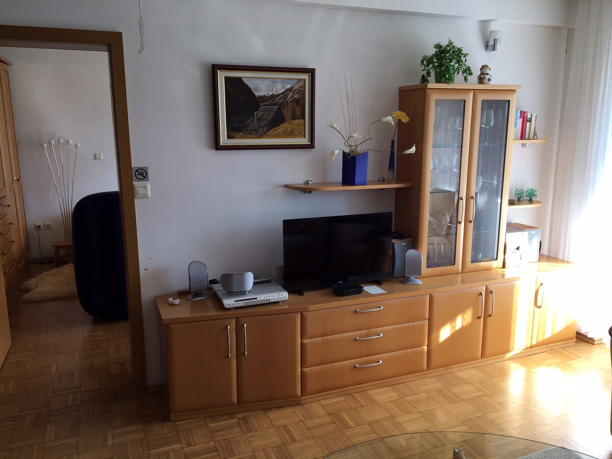 Apartemen 2 kamar tidur kami dengan 1 kamar mandi, dapur, ruang tamu spacius dengan sofa dan meja makan, AC, dan teras spacius terletak hanya sekitar 100 meter dari Danau Bled (area berenang). Tempat ini berlokasi di daerah yang sangat damai. Tempat ini memiliki pintu masuk sendiri dan berlokasi di rumah kami (jadi kami selalu dekat untuk membantu). Kami adalah keluarga yang terdiri dari 5 orang dan dengan senang hati akan menerima Anda. Keberlanjutan: Kami menghasilkan lebih banyak energi daripada yang kami gunakan. Pajak pariwisata (3,13 untuk orang dewasa per hari, 1,56 untuk anak - anak di atas 7 tahun) belum termasuk.