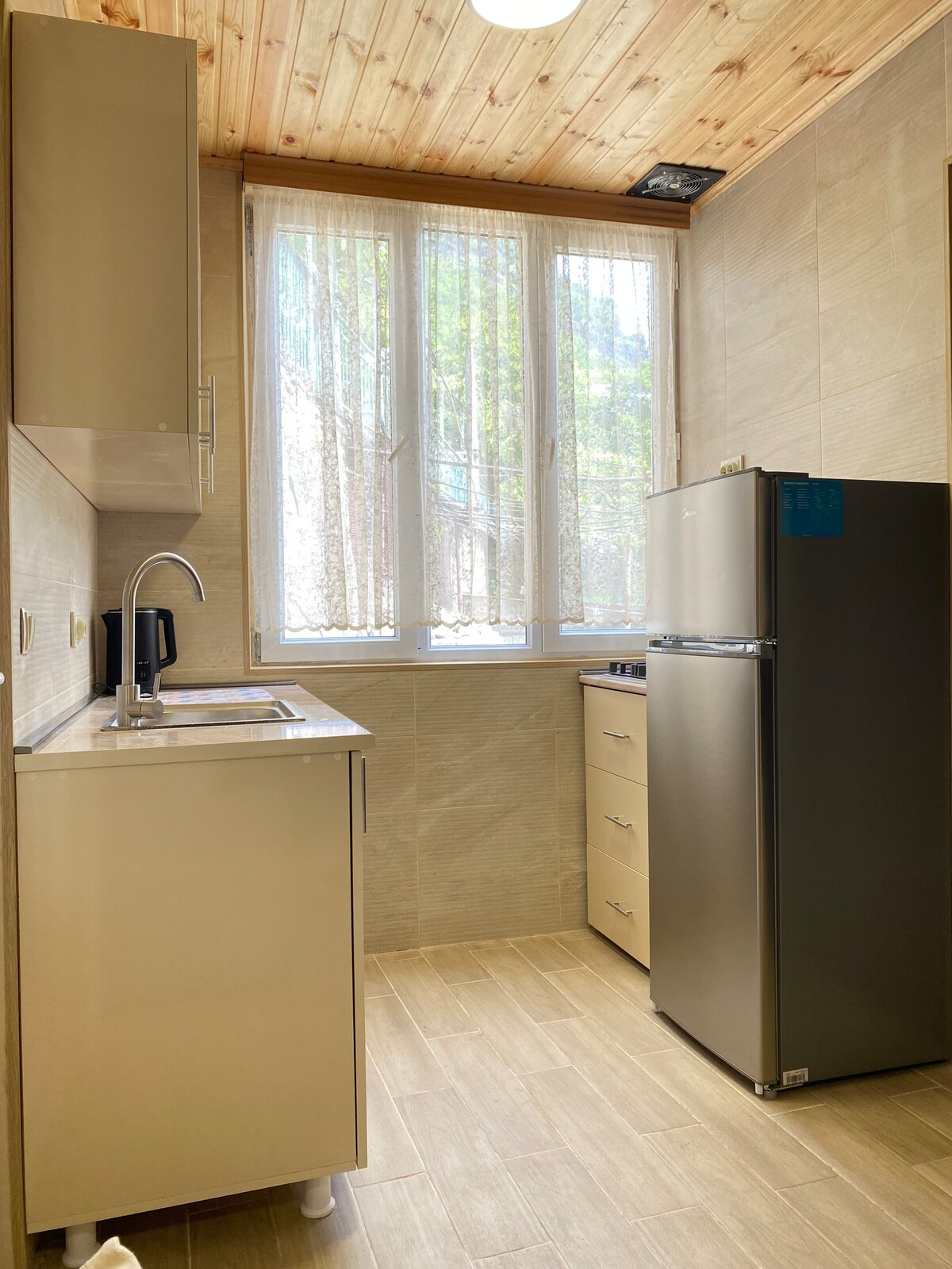 Tempat pondok ini memiliki studio dengan tempat tidur double dan sofa lipat. Dapat menampung hingga 2/4 orang dan dilengkapi perabotan lengkap dan siap untuk wisatawan. tempatnya Terletak di tengah hutan yang tenang, pondok putih yang menawan ini memancarkan daya tarik yang unik dan menarik. Kombinasi pesona klasik pondok putih, perapian yang nyaman, dan balkon yang menarik menciptakan surga ajaib tempat Anda bisa melarikan diri, meremajakan diri, dan menikmati keindahan sederhana tempat peristirahatan hutan Anda.