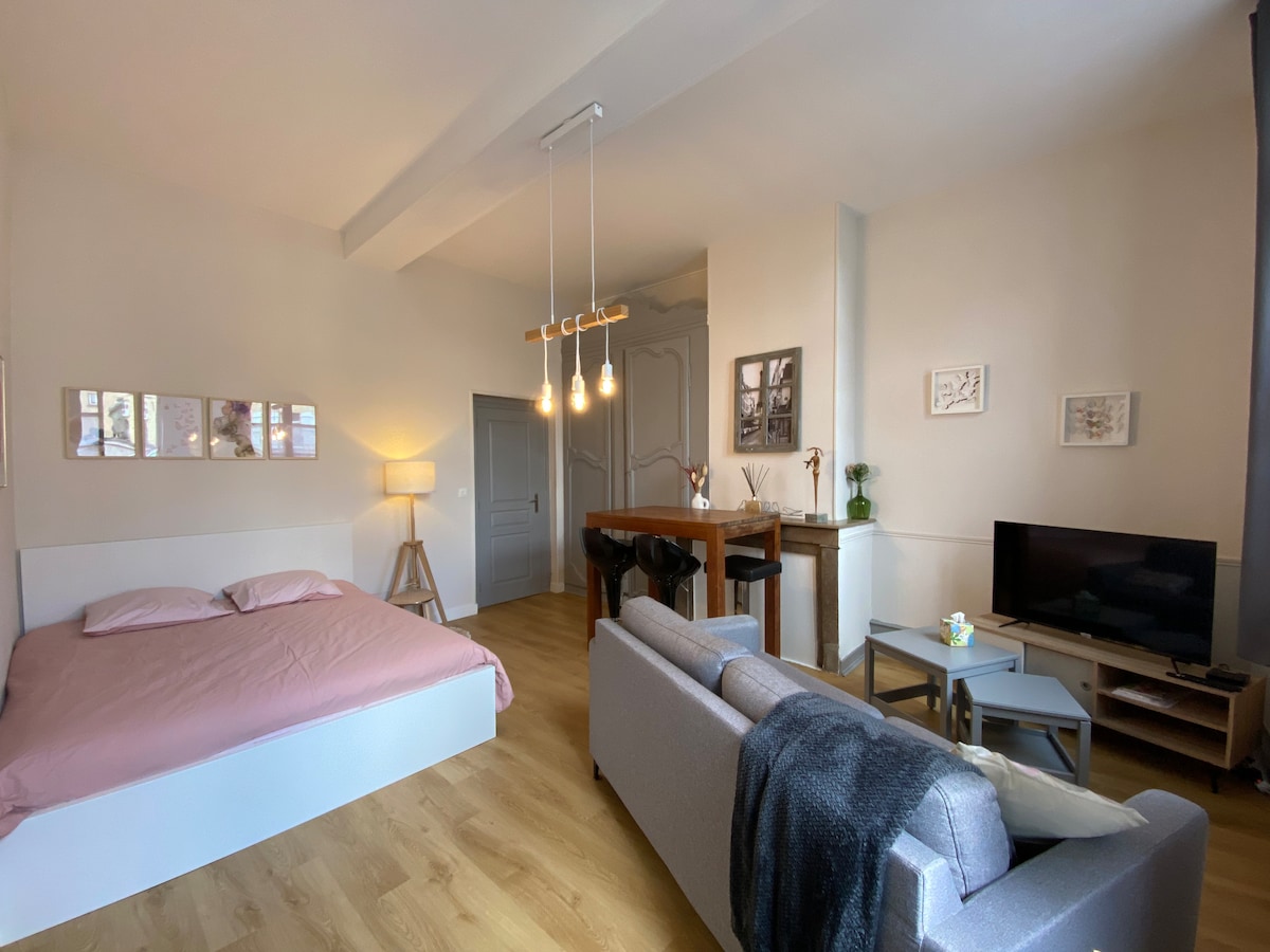 Mutiara langka yang akan menggoda Anda dengan pesona, kecerahan, dan lokasinya. Terletak 2 langkah dari La Maison du Marais, 5 menit berjalan kaki dari jantung kota yang bersejarah, 1,5 km dari stasiun kereta api, apartemen ini menampung 2 orang dewasa dan 2 anak - anak (tempat tidur sofa baru) Di lantai dasar tempat tinggal aman yang indah, akomodasi yang damai ini menawarkan masa inap yang santai, dapur terbuka yang lengkap, kamar tidur, kamar mandi dengan pancuran/wastafel , dan toilet terpisah. Seprai/handuk disediakan.