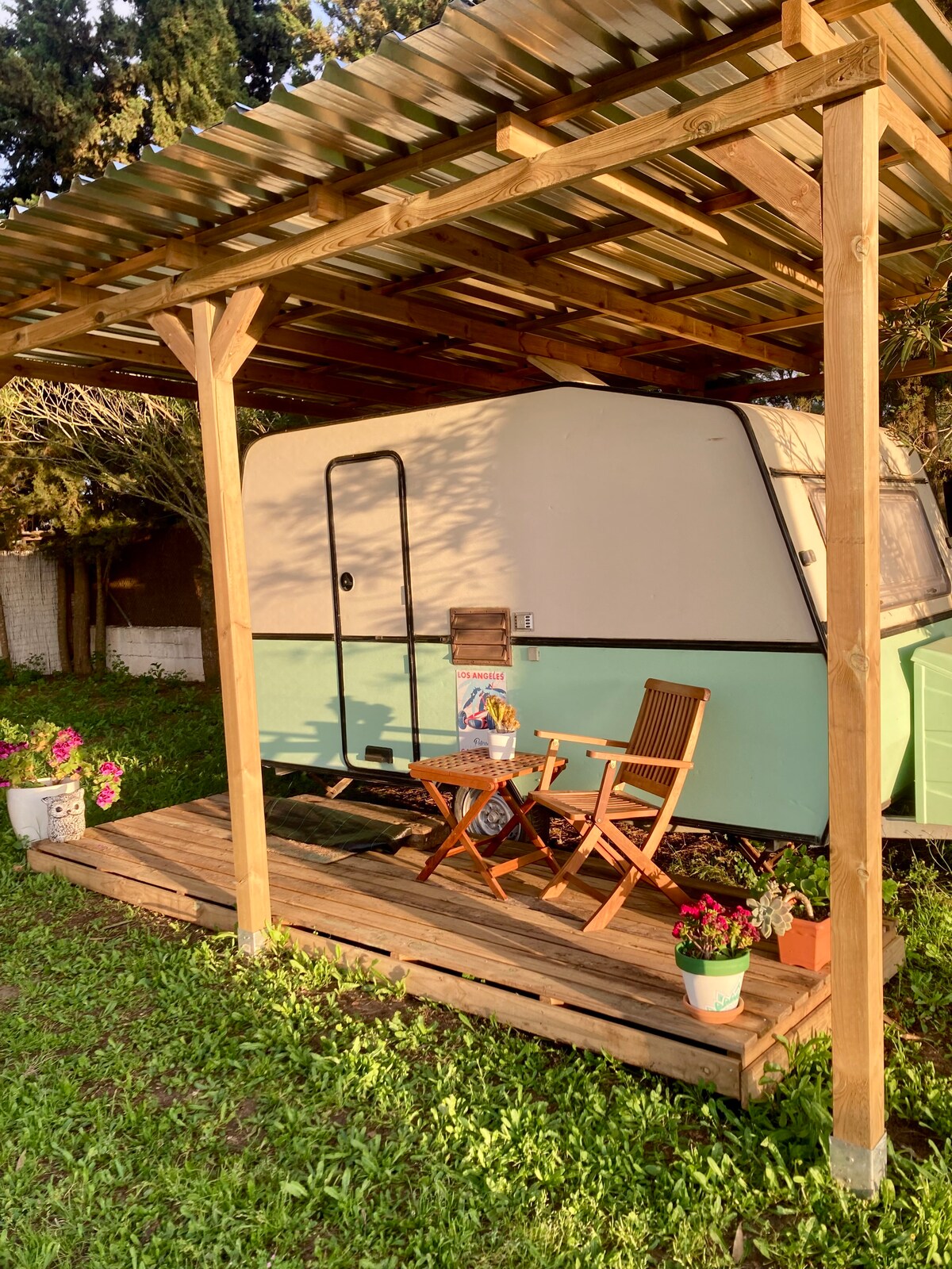 Boho caravan con encanto junto a la piscina.