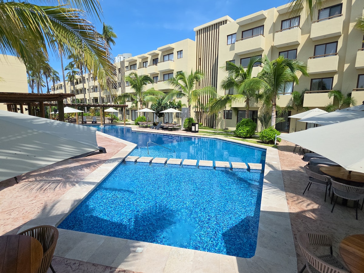 Apartemen nyaman dengan kolam renang 500 meter dari pantai di area terbaik Mazatlan. Kolam renang, jacuzzi, tempat tidur gantung, barbekyu, pemanggang, lapangan golf mini, area bermain anak - anak, parkir, dan akses terkontrol. Wifi, TV kabel, roku, 2 kamar tidur, ruang makan, 1 kamar mandi, balkon menghadap lapangan golf. Ideal untuk beristirahat dan menghabiskan beberapa hari untuk berlibur.