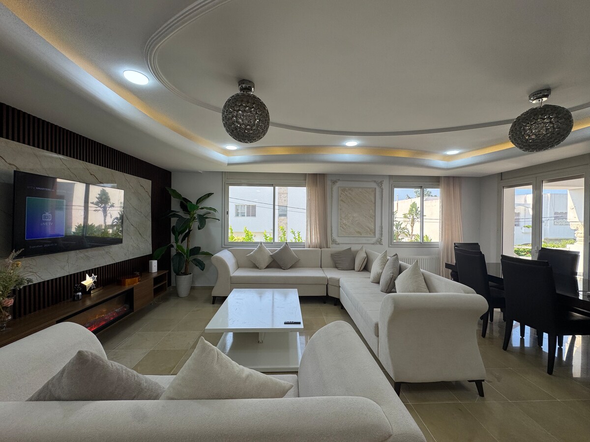Rumah mewah 1 kamar tidur, 2 kamar mandi dengan teras besar untuk menikmati matahari dan malam di luar ruangan. Terletak di perumahan yang aman dan dijaga dengan baik di Gammarth. AC, parkir pribadi, Wi-Fi berkecepatan tinggi, dan Smart TV – cocok untuk pasangan, keluarga, atau pekerja jarak jauh. Dekat dengan pantai dan restoran. Pesan sekarang untuk masa inap yang nyaman dan santai. Berlokasi strategis, 5 menit berkendara dari kota La Marsa.