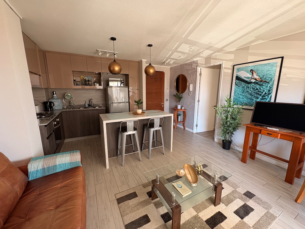 Disfruta una grata estadía en este depto. full equipado de 2 dormitorios y 2 baños, ubicado una zona segura y de excelente conectividad. Cuenta con amplio living comedor, cocina independiente, balcón cerrado c/ vista panorámica y estacionamiento privado. A pasos encontrarás un strip center con farmacia, pastelería y licorería, y a minutos además supermercado, restaurantes y el centro de la ciudad. Edificio con conserjería 24 hrs, ascensores, quincho y gimnasio