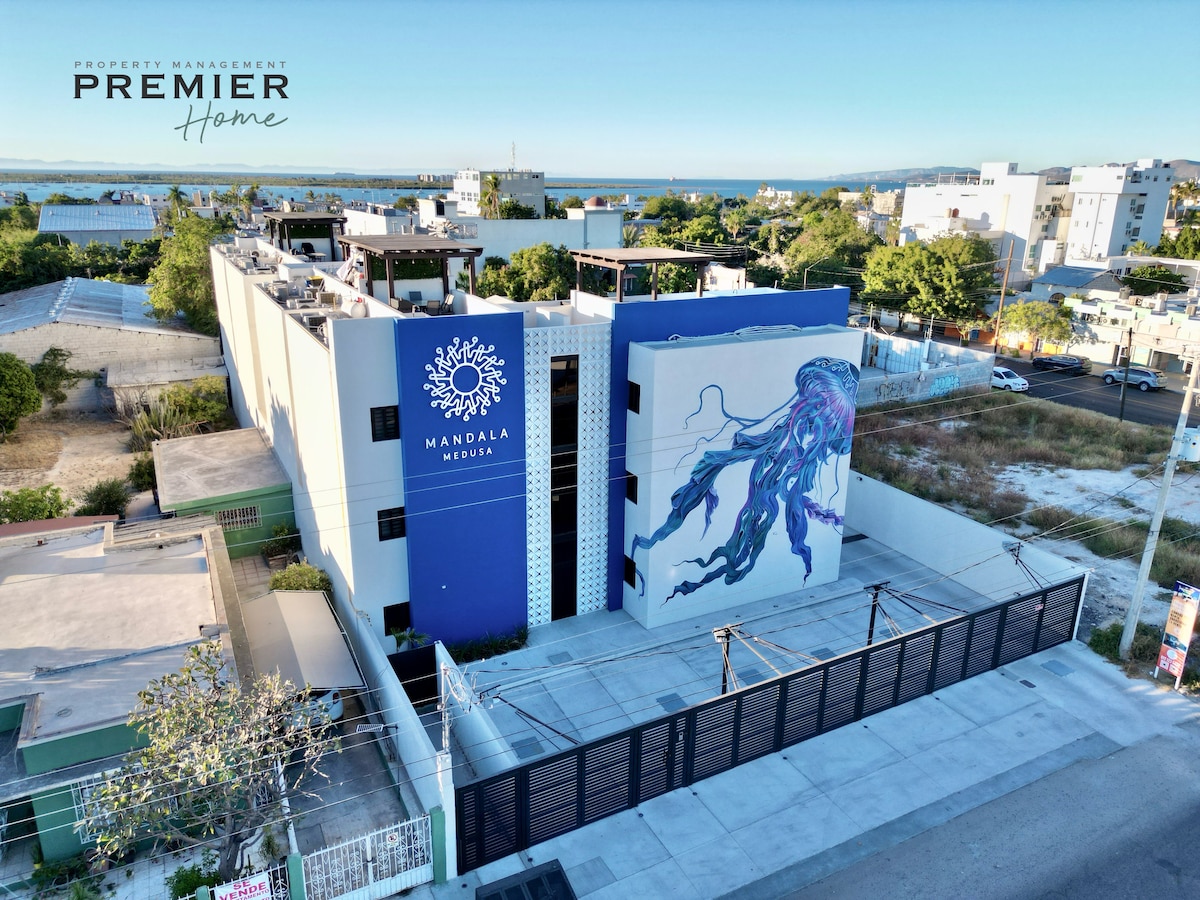 Kondominium dua kamar tidur modern ini berjarak dua blok dari Tepi Pantai / Malecon yang indah. Tempat ini mencakup balkon pribadi, teras dek atap komunal dengan palapa besar yang teduh, jacuzzi, BBQ, area duduk, dan pemandangan laut dan matahari terbenam yang indah. Kondominium ini memiliki semua fasilitas yang diperlukan - mesin cuci/pengering, dapur lengkap, 2 smart TV, AC, dan WiFi. Toko kelontong, kafe, restoran terbaik La Paz & pasar organik semuanya berjarak beberapa menit berjalan kaki. Area aman dan tenang. Parkir aksesibel.