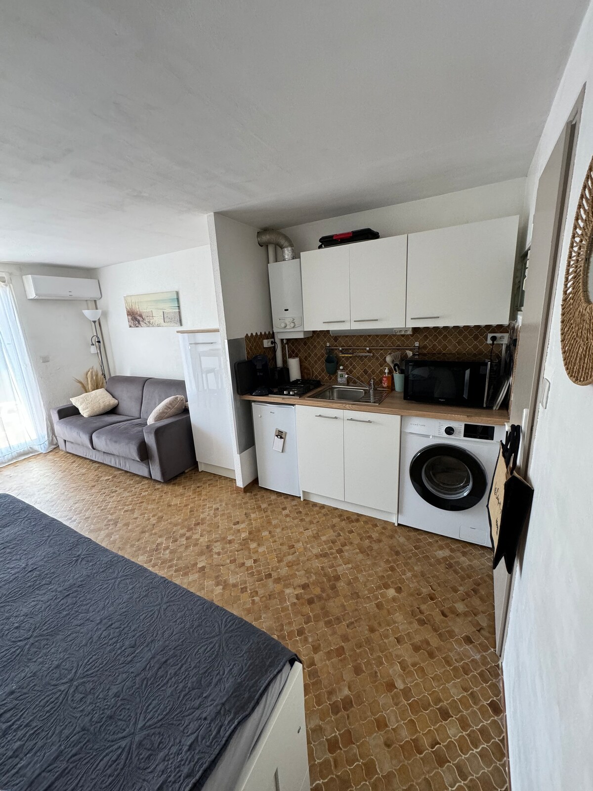 Studio ber-AC yang bagus yang bisa menampung 2 orang dewasa 1 anak di tempat tinggal yang aman dengan parkir. Dirombak total pada Juni 2023. Akses langsung ke pantai La Roquille yang diawasi. - Dapur lengkap - Kamar mandi (meja rias, pancuran besar, dan toilet). - Ruang tamu: 1 sofa bed double, meja makan, kursi, TV, meja samping dan penyimpanan. Teras dengan pemanggang, area makan, dan kursi dek. Dekat dengan toko, restoran, dan pondok jerami. Jalan kaki ke pelabuhan.
