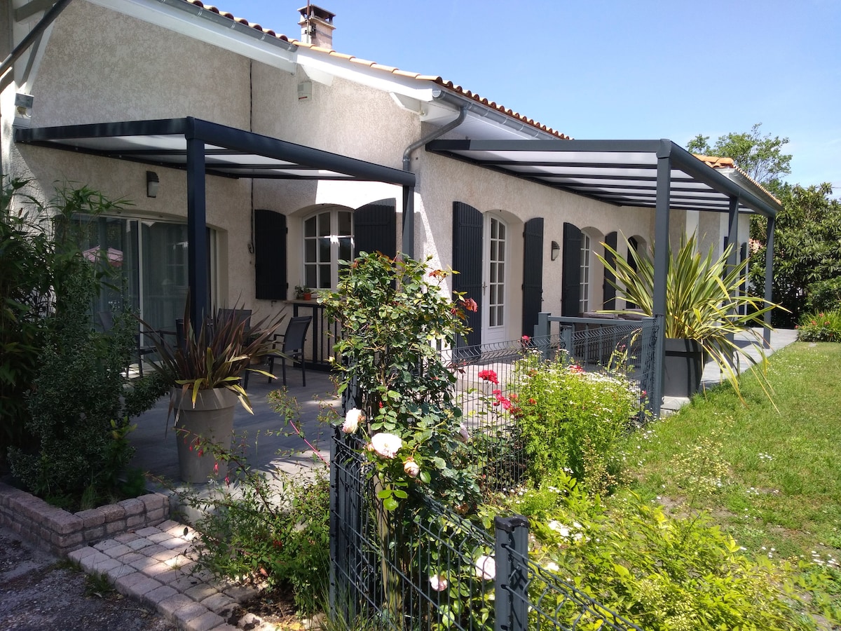 Penginapan menawan 3 kamar di lingkungan yang tenang dan hijau. Apartemen ini independen namun bersebelahan dengan rumah kami. - Wisatawan yang disebutkan dapat menikmati kesenangan kolam renang kami, yang dibagikan dengan kami! Anne Marie dan Serge menyambut Anda dan jika mau, persembahkan di Wilayah, kebun anggur Pessac Léognan, Bordeaux, bukit pasir Pyla, dan Arcachon Bassin