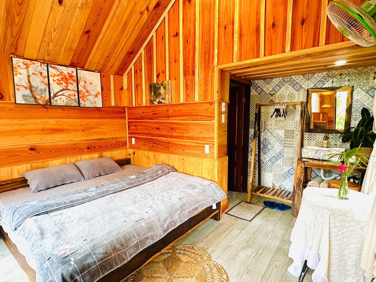 Ini adalah salah satu rumah kayu kami yang paling kami sukai – tempat peristirahatan nyaman yang dirangkul oleh alam. Kabin ini memiliki tempat tidur lebar 2 meter yang luas dengan pemandangan menakjubkan yang menghadap ke seluruh taman. Tamu bisa menikmati masa inap yang benar - benar santai, menikmati lingkungan yang damai dan merasakan pesona Dalat yang autentik — pagi yang tenang, udara yang segar, dan taman yang mekar penuh tepat di luar jendela Anda.