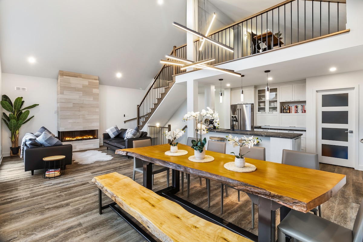 Escape to a new luxury waterfront chalet on the L’Assomption River. This 3,200 sq ft home offers stunning mountain views, an 8-person hot tub, and game room. Comfortably sleeping 9 guests, it's the perfect intimate retreat just 1 hour from Montreal and minutes from skiing. Enjoy superior quality, handcrafted details, and direct river access for an unforgettable stay.