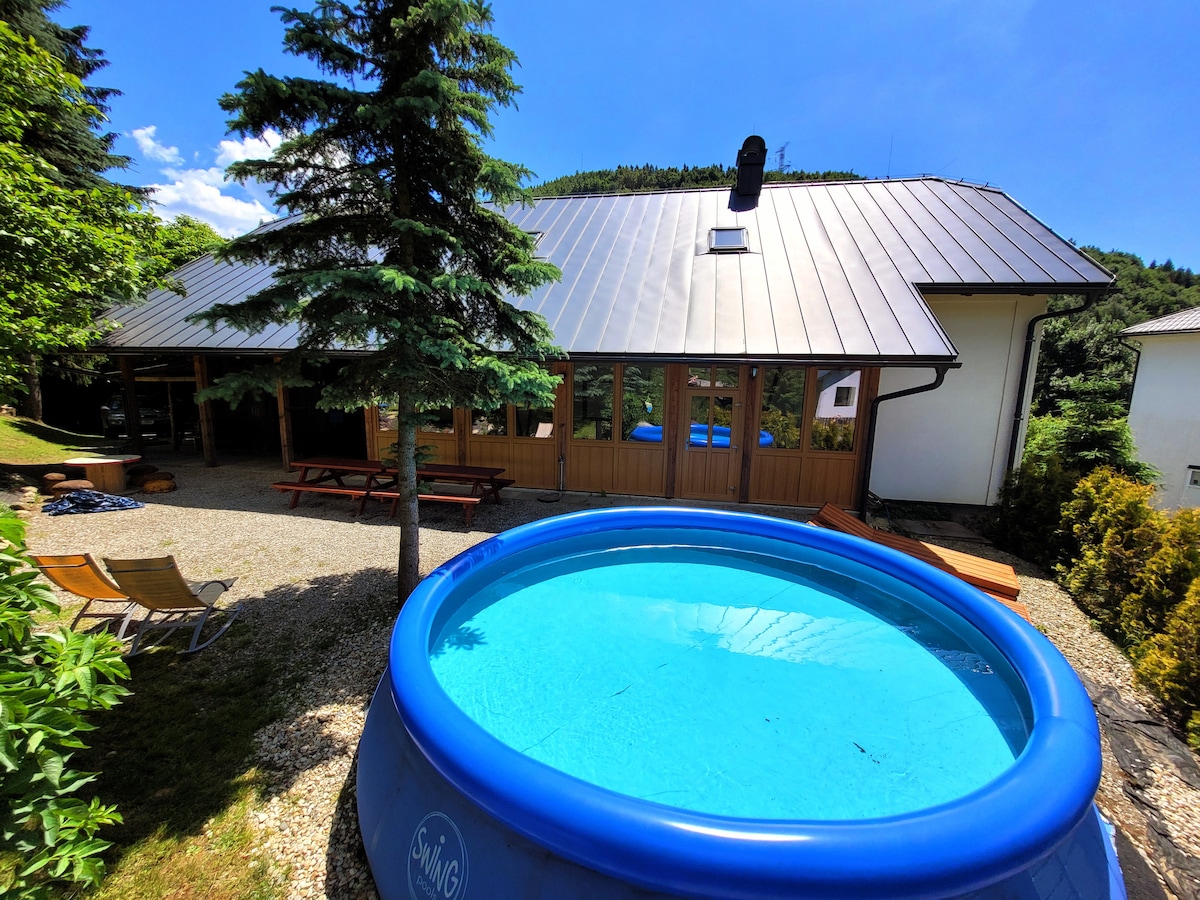 Nikmati masa inap yang luar biasa dengan area kesehatan luar ruangan yang dilengkapi bak mandi air panas, sauna, dan bak mandi pendingin, semuanya dengan pemandangan yang menakjubkan. Di musim panas, Anda akan menikmati kolam renang, kursi berjemur, tenis meja, rangka pendakian, rumah anak-anak dengan dapur kecil. Api unggun, tempat duduk tertutup, BBQ. Rumah ini terletak tidak jauh dari stasiun kereta dan resor ski Kouty, di mana terdapat restoran, pizzeria, dan arena bowling. Kami menawarkan ketentuan diskon untuk ski dan bus ski gratis ke resor Kouty.