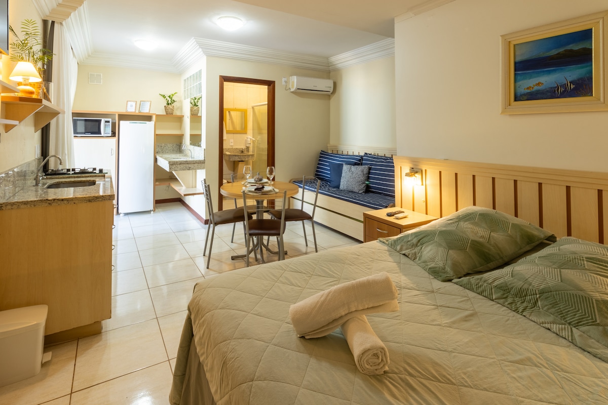 Apartamento tipo hotel. Dormitório e banheiro com TV, AR condicionado e frigobar. (Cama de casal + 1 solteiro ou 3 de solteiro). Estacionamento e café da manhã terceirizado, cobrado a parte direto no local. * Check-in após as 15 horas - Check-out as 11 horas. * Diárias sem café da manhã * Proibido animais de estimação * Apartamento tipo hotel para até 3 pessoas * Recepção 24h Horários de entrada e saída devem ser respeitados conforme a politica.
