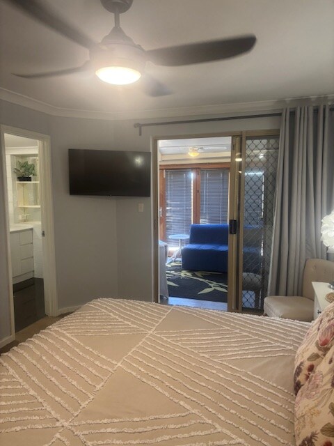Silver Gypsy Flat adjoins our home. Key entry, secure steel window & door screens, a/c, table, chairs, pantry, induction cooktop, mini-oven, sandwich maker, frypan, kettle, toaster, pod coffee maker, juicer, glass oven, microwave, rice cooker, fridge/freezer, china, cutlery & glasses. Sofa bed, new 50" tv, lamps, queen bed, desk, chaise lounge, walk-in robe & ensuite, pillows, quilts & linen. Private garden, BBQ, patio table, chairs, brolly & free offroad parking. Late arrivals' Key Lock.