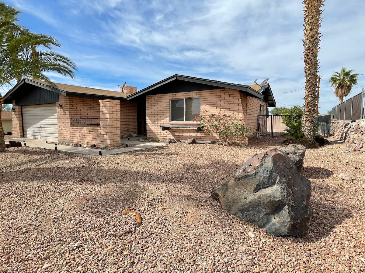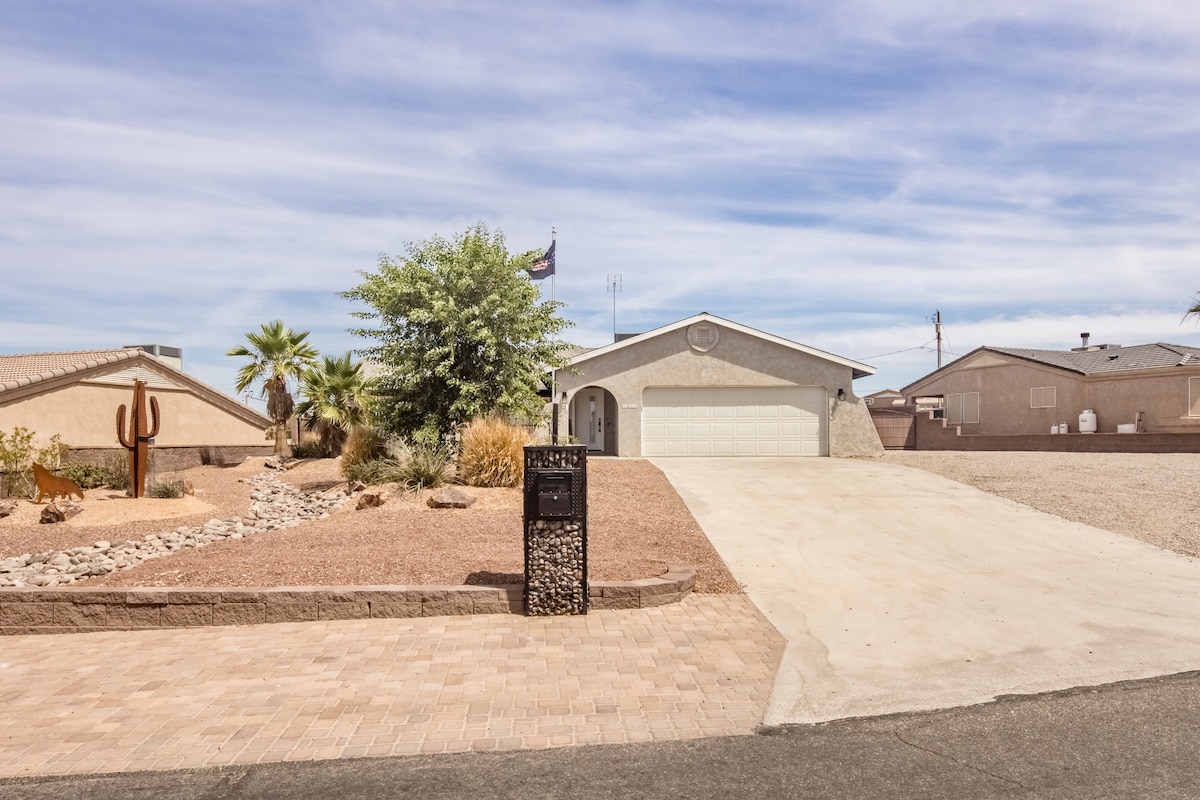 Bersantai dan nikmati rumah sisi selatan kami yang lucu. Karya seni lokal yang menarik, Banyak tempat parkir perahu di luar jalan, teras belakang sore yang teduh dengan pemanggang Weber yang bagus untuk bersantai setelah seharian di danau. Berdinding di halaman belakang. teras depan yang teduh di pagi hari untuk menikmati kopi dari Kurig. Kami bahkan menyediakan sepeda, floaties, serta berbagai mainan air dan pantai. WIFI, kabel, TV streaming, laundry lengkap, semua yang Anda butuhkan untuk liburan Havasu Anda. Izin LHC 035922