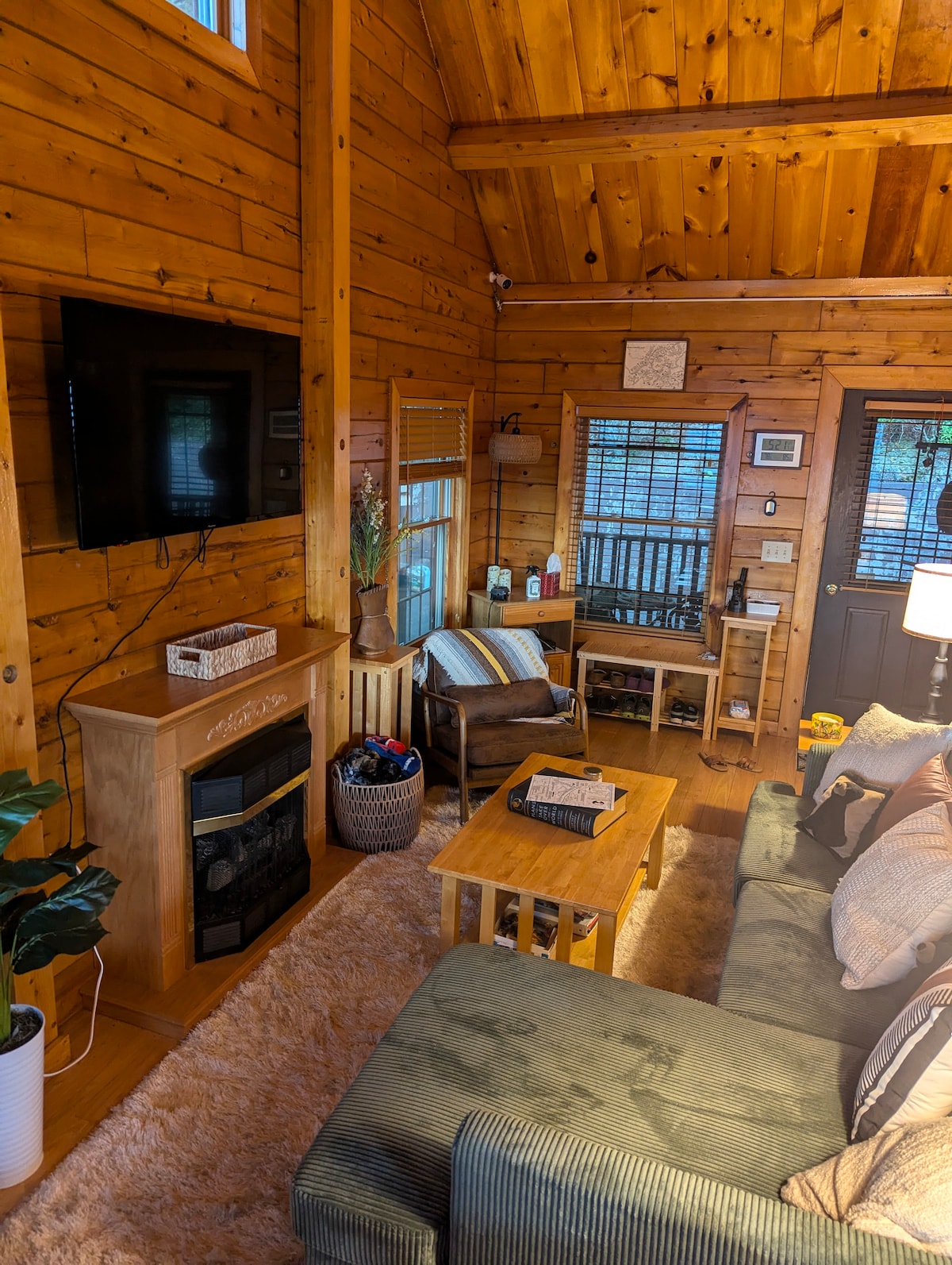 Sophie's cabin is tucked away in the forest of the gated Riverbend Community. It is a quiet retreat ideally suited for a couple looking to unplug and be in nature. It's both spacious and cozy with a private bedroom, full bathroom, full kitchen, and a comfortable living room. There is a large private deck behind the cabin with a dining set, gas grill, and 2 lounge chairs. A large Ingles grocery store and several restaurants are open nearby. Our private lake is open and as pretty as ever.