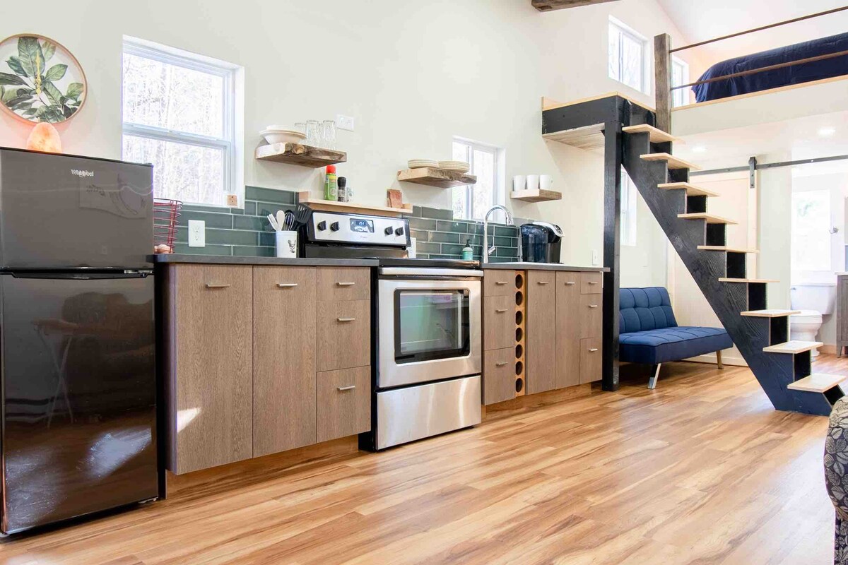 Dikelilingi alam, makhluk hutan, tupai & rusa sesekali. Pemandangan tenang dari jendela ekstra besar di rumah kecil terinspirasi Skandinavia ini. Sebagian offgrid dengan toilet kompos Natures Head, fasilitas untuk dua tamu tidur, menyiapkan makanan sederhana & bersantai. Pancuran curah hujan panas, mesin cuci piring, & WiFi cepat. Menit dari layanan darurat & bandara CLT. Mudah 10 menit berkendara ke kota untuk makanan & minuman. Terletak di tempat tinggal pribadi kami dengan jalan masuk bersama & pemantauan keamanan di area parkir.