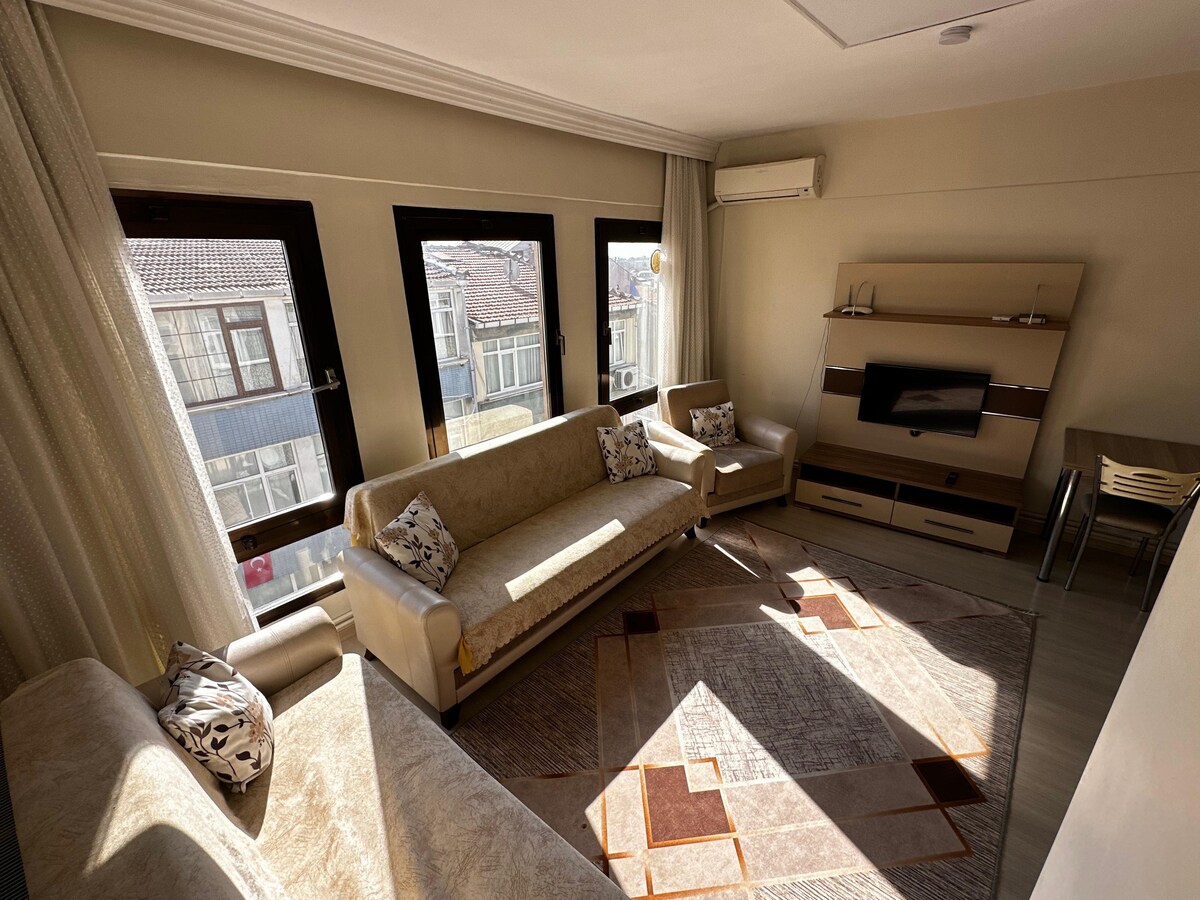 Rumah 2+1 yang luas dan nyaman di tengah kota Istanbul, 1 menit dari trem dan 5 menit dari metro. Dekat dengan banyak rumah sakit dan pusat kesehatan. Anda bisa dengan mudah menjangkau Sultanahmet, Hagia Sophia, Istana Topkapı, Grand Bazaar, Eminönü, Gülhane, Beyazıt, dan Sirkeci dalam 10-15 menit dengan trem. Cocok untuk keluarga dan masa inap jangka panjang. Wi-Fi fiber, Smart TV 4K, check-in mandiri, dan dapur lengkap tersedia. Berjarak 5 menit dari Terowongan Eurasia.