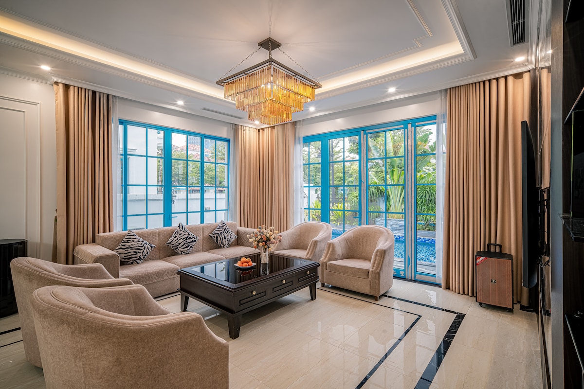 Terletak di Bai Chay Beach Villa 5 menit berjalan kaki ke Bai Chay Beach, dekat Jalan Jalan, Taman Air, Sun World, Pelabuhan Kereta Internasional, Pasar Makanan Laut Terutama 9 tempat tidur besar yang bisa menampung 18 orang dewasa. 🏡 (2): - Pembantu kepala pelayan setiap saat - KOLAM RENANG PRIBADI, pemanggang barbeku. - Lantai pertama mencakup ruang tamu + Karaoke + ruang dapur. - Lantai 2 mencakup 02 kamar tidur, 02 Wc mandiri, 02 TV pintar - Lantai 3 terdiri dari 02 kamar tidur, 02 toilet, 2 smart TV - Lantai 4 mencakup 1 kamar tidur, toiletnya mandiri.
