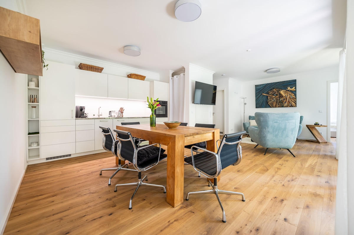 Welcome to our exclusive holiday flat "Strandstudio 19", which invites you to a wonderful short or long stay directly on the beach of Binz. It offers a great & comfortable atmosphere, perfect for up to 4 people: → Terrace directly on the beach promenade → pvt. beach chair → 30 seconds to the beach → 200m to the pier → elektric chimney → 1 comfort king-size box-spring bed (1.80 x 2.00m) → Sofa bed (1.40 x 2.00m) → 50" SmartTV & WLAN → Fully equipped kitchen → High-quality furnishings