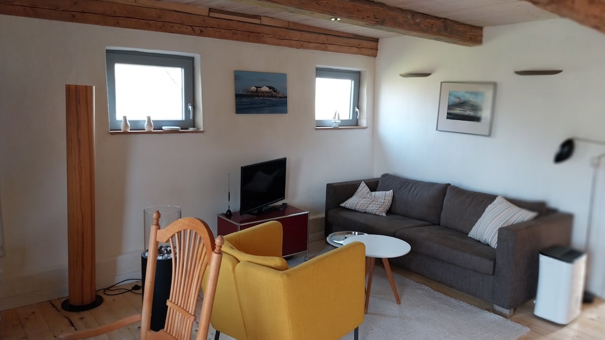 Apartemen luas dengan ruang tamu lebih dari 155 m² ini diintegrasikan ke dalam bekas hayloft dari bekas pertanian di Efkebüll yang indah. Tempat ini menawarkan kehidupan santai di dua lantai dan konsep pencahayaan khusus: di pagi hari, matahari menyapa kamar mandi dan dapur, di siang hari ia berjalan ke ruang tamu dan ruang makan yang luas, dan di malam hari ia mengucapkan selamat tinggal di kamar tidur. Kemurahan hati, kelapangan, dan pemandangan yang tidak terganggu melalui jendela depan yang rimbun menjadi ciri pengalaman hidup.