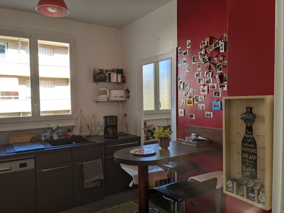 Simplifiez-vous la vie dans ce logement paisible, top isolé, proche de tout. Situé au sud à 30 mètres du Diocèse au 1er :25 m2 habitable lumineux bien équipé dans une résidence rénovée de 6 petits apparts. Tramways, bus ,commerces, restos à proximité. WIFI 2Gigabits +TV aérateurs détecteur de mouvement entrée Pas de vis à vis On aime le calme .Un lieu bien surveillé par un collègue logé sur place . Compteur électrique sécurisé couloir jardin privé /table/barbecue. bienvenu!
