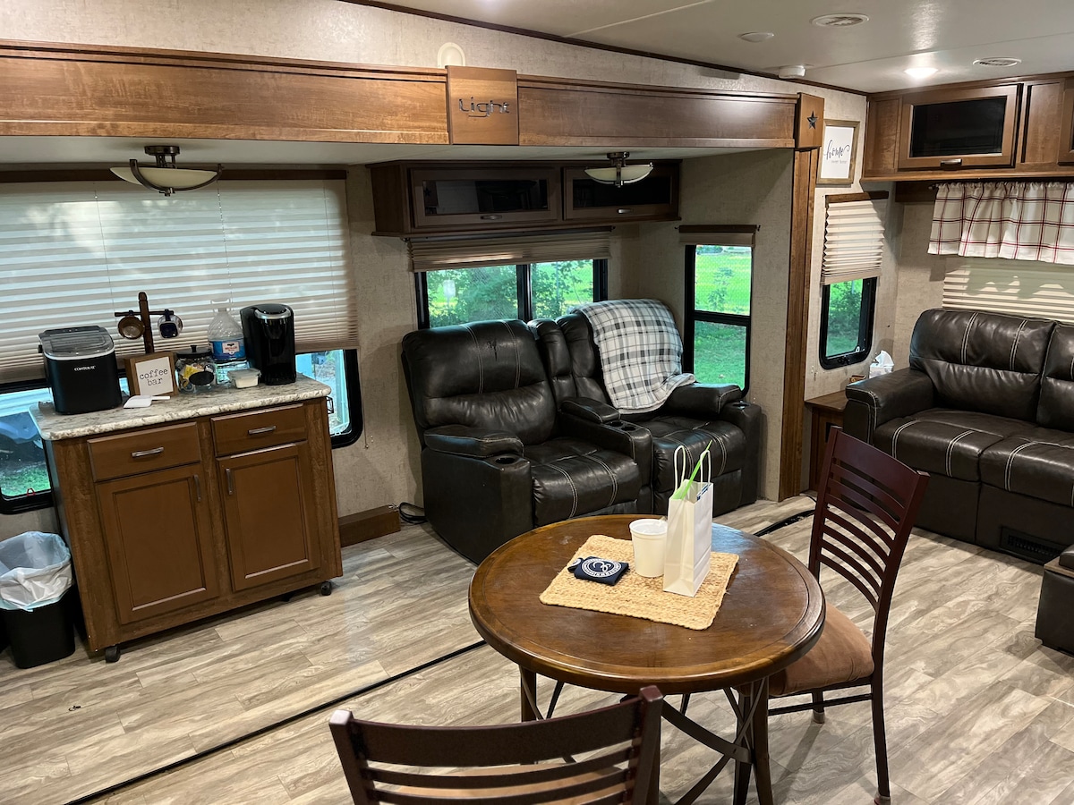 Welcome to your cozy home on wheels! Nestled in a peaceful spot near downtown Elizabethtown, this stocked fifth-wheel camper has a comfy bed, kitchen, bathroom, A/C and Wi-Fi. Enjoy mornings with coffee, nights by the fire pit, or streaming your favorite shows. With outdoor seating, a grill, and all the essentials. You will also have access to the campground amenities to include the pool and a catch and release pond. It’s the perfect spot to relax, explore, or unplug in comfort and style.