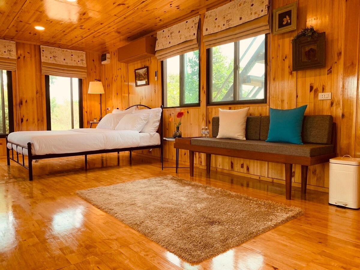 Bayangkan diri Anda berada di rumah kayu pinus di tengah padang rumput dan pepohonan yang luas. Bersantai di balkon kayu yang luas dengan kopi, menikmati pemandangan Khao Yai yang menakjubkan. Di dalam, aroma kayu pinus dan sinar matahari memenuhi ruang yang nyaman. Fasilitas termasuk unit AC, TV 50 inci, WiFi, dan kamar mandi dengan rain shower. Dapur luar ruangan memiliki kompor listrik, microwave, pemanggang roti, dan kulkas. Nikmati matahari terbit keemasan, matahari terbenam yang menakjubkan, dan mengamati bintang dari atap dengan pemandangan Khao Yai 360 derajat.
